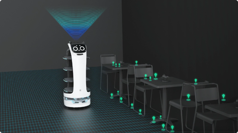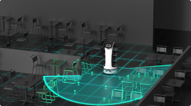 Waiter uses laser sensors to scan the environment, creating a detailed map by measuring distances to objects. It helps the robot navigate accurately by continuously updating its position relative to the map.